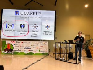 Quarkus ! Ce framework d’application Java qui est venu souffler un vent nouveau dans l’écosystème Java. Le speaker nous a rappelé les avantages qu’apporte Quarkus avec les devs services, le continuous testing, la dev ui, la compilation native, la facilité de pouvoir à la fois coder en impératif et en réactif, etc…. Je passe rapidement car cela fait déjà quelque temps que ces choses existent et ont été présentées.