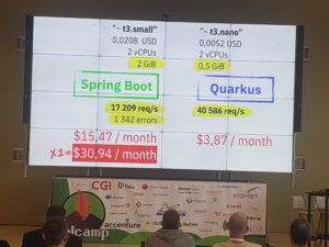 Enfin, la présentation s’est terminée par quelques chiffres sur l’empreinte mémoire d’une application Quakus ou encore des benchmarks sur son throughput req/sec. Ces chiffres étaient mis en concurrence avec le framework d’application Spring.